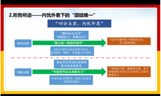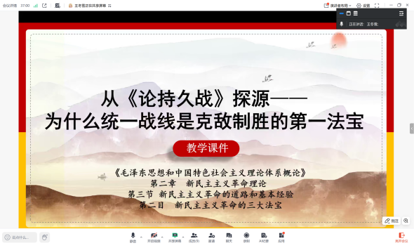 王冬雪老师结合青教赛备赛专题,对“论持久战”一文进行深入讲解。她以《论持久战》原文内容为主线,从理论根基、国际形势、国内局势和实力对比四个方面重点阐述了统一战线为何是抗日战争克敌制胜的第一法宝。