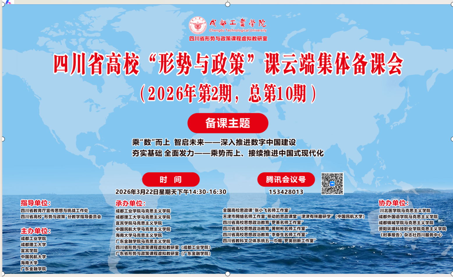 此次备课会为本学期四川省高校“形势与政策”课第二次云端集体备课会,由四川省教育厅宣传思想与统战工作处、四川省高校“形势与政策”分教学指导委员会指导,成都工业学院、成都理工大学、宜宾学院、中国民航大学、海南大学、广东金融学院主办。承办单位包括学院“移动的思政课堂”“津津有味趣研学”2个网络名师工作室。