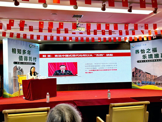 2023年5月19日,受国寿(天津)养老养生投资有限公司党支部邀请,原理教研室彭金芝老师赴国寿嘉园·天津乐境养老社区参加党日活动,并为社区全体党员讲授题为“中国式现代化的缘起:五四时期的中国现代化道路探寻”的主题党课。
