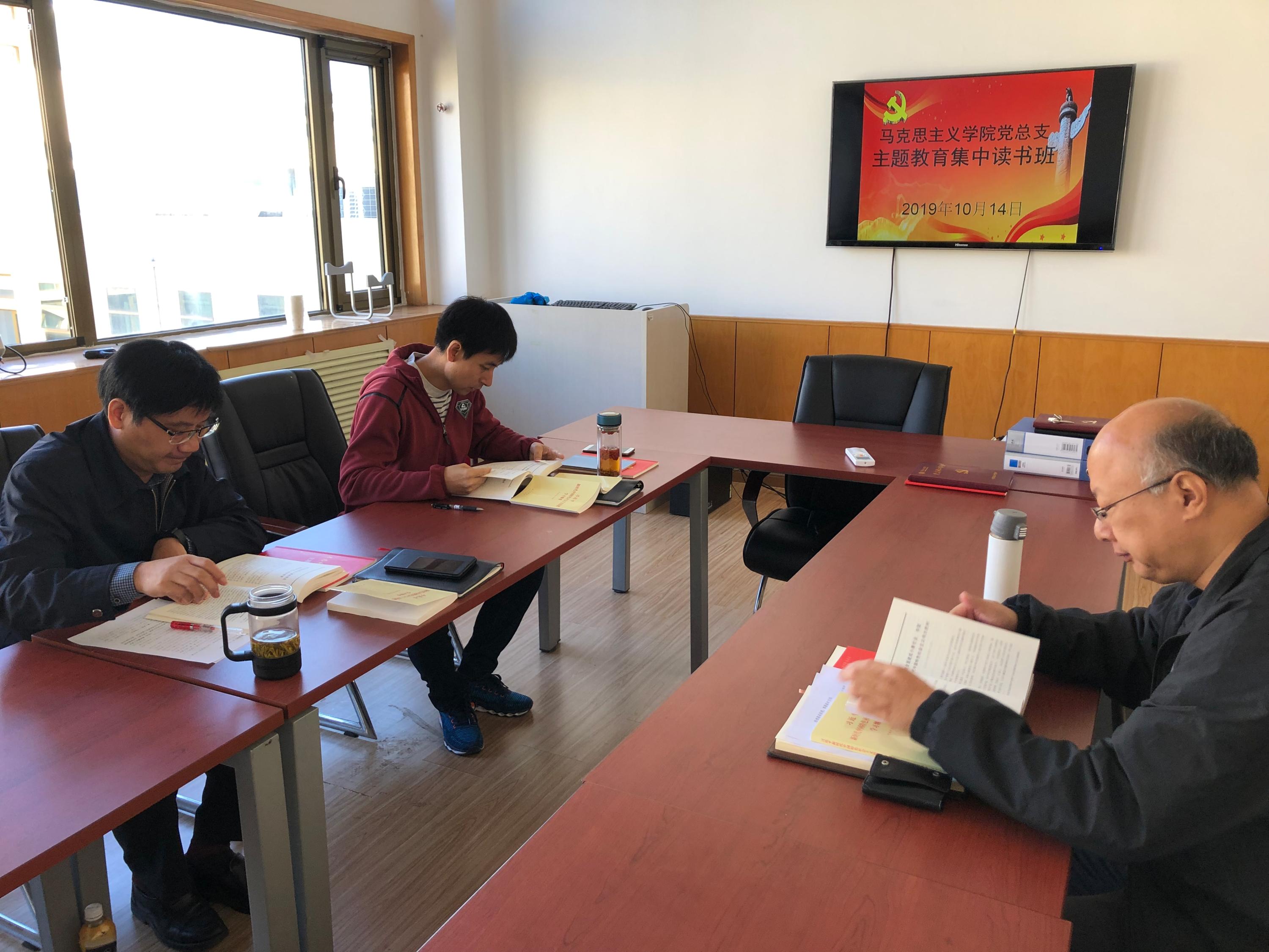 2019年10月14日,马克思主义学院党总支召开主题教育集中读书班第4期,学习内容为:《重要论述选编》中“324页学习马克思主义基本原理是共产党人的必修课”、“335页在纪念马克思诞辰二百周年大会上的讲话”以及《学习纲要》中“十九、掌握马克思主义思想方法和工作方法”。
