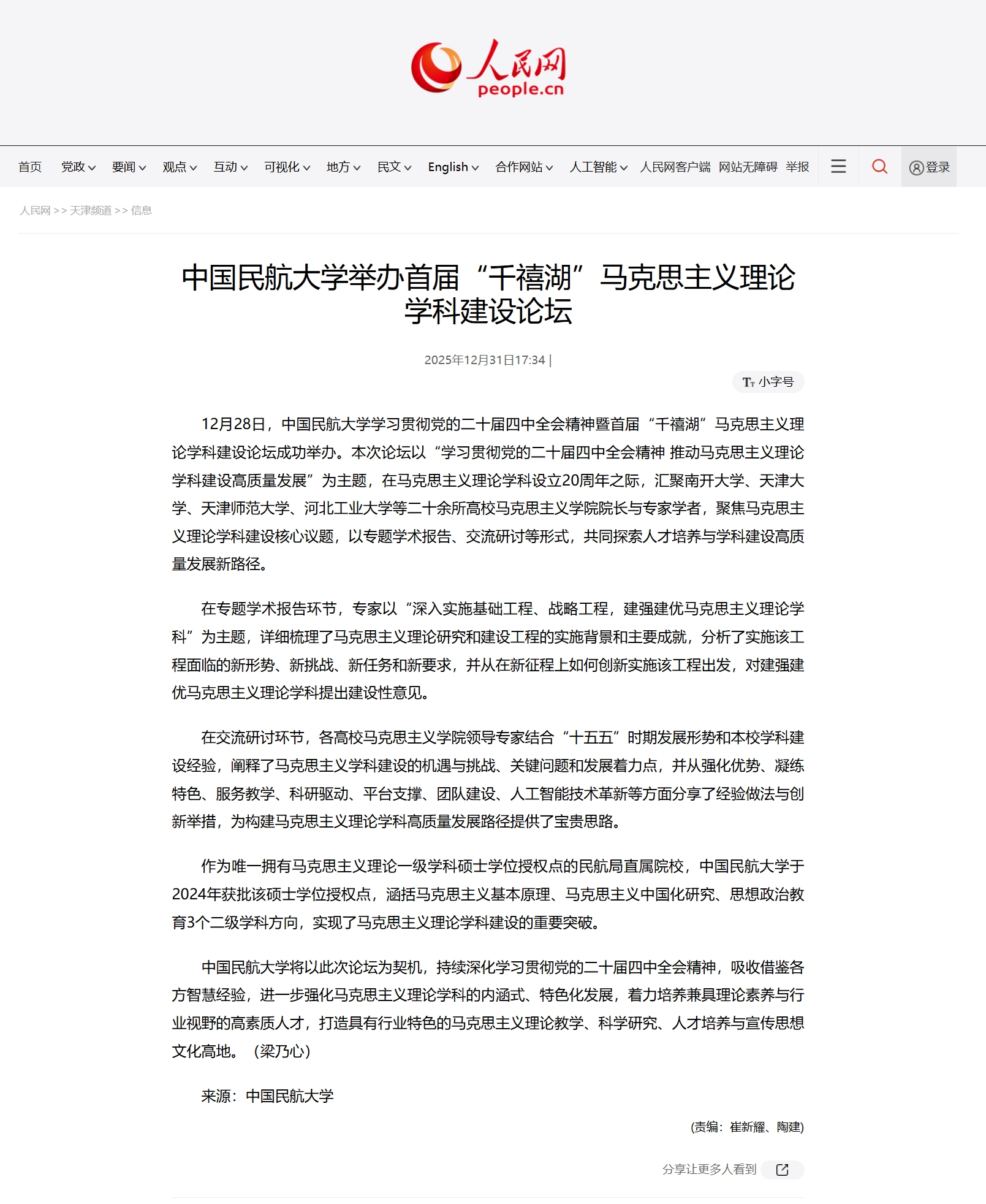 人民网 天津频道:中国民航大学举办首届“千禧湖”马克思主义理论学科建设论
