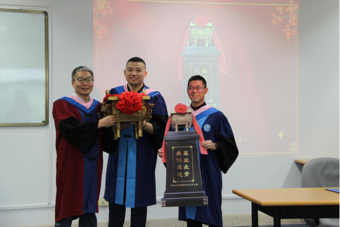 班长杨楠代表中国民航大学2022级MBA全体学员敬献镌刻“鼎铸卓越,基业长青”的纪念鼎。杨楠动情表示:“此鼎不仅是感恩之礼,更是誓言之鼎——我们将以‘鼎新’之智推动行业变革,以‘鼎力’之力守护安全底线,让中航大MBA成为民航高质量发展的‘动力引擎’。以此鼎祝愿母校MBA中心:桃李鼎盛,基业长青!”