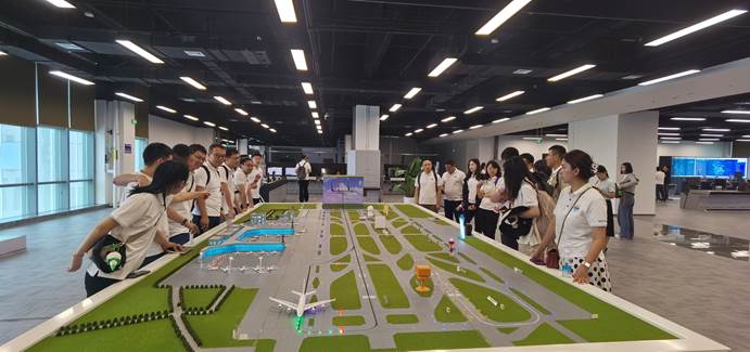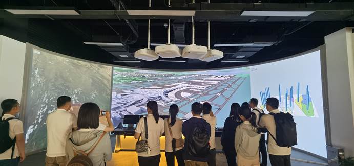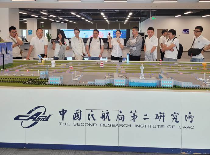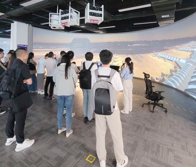 交流会后,在专业解说员的引导下,同学们参观了中国民航科技创新史陈列厅、民航二所新质生产力展厅和民航全流程生产运行仿真平台。在中国民航科技创新史陈列厅,大家重温中国民航的发展和腾飞,以及中国民航二所近年来在民航科技创新领域取得的重大成果。在接下来的新质生产力展厅和民航全流程生产运行仿真平台,同学们真真切切看到智慧空管、智慧机场、智慧航化、智慧通航的科技成果,很多系统和设备虽已在民航单位使用,但同学们对它们的创新点和使用原理仍有很多疑问,现场互动热烈。