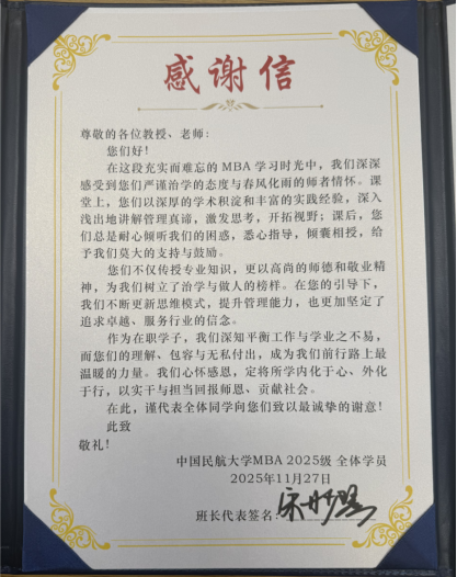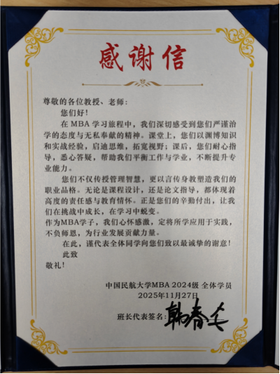 感恩暖冬,尺素传情。2025年感恩节之际,中国民航大学2024级与2025级MBA学子分别自发撰写感谢信,以全体签名的郑重形式,向MBA中心全体任课教师与导师表达深切敬意与感恩之情。这份饱含真心的礼物,如冬日暖阳,让耕耘在一线的老师们倍感温暖。