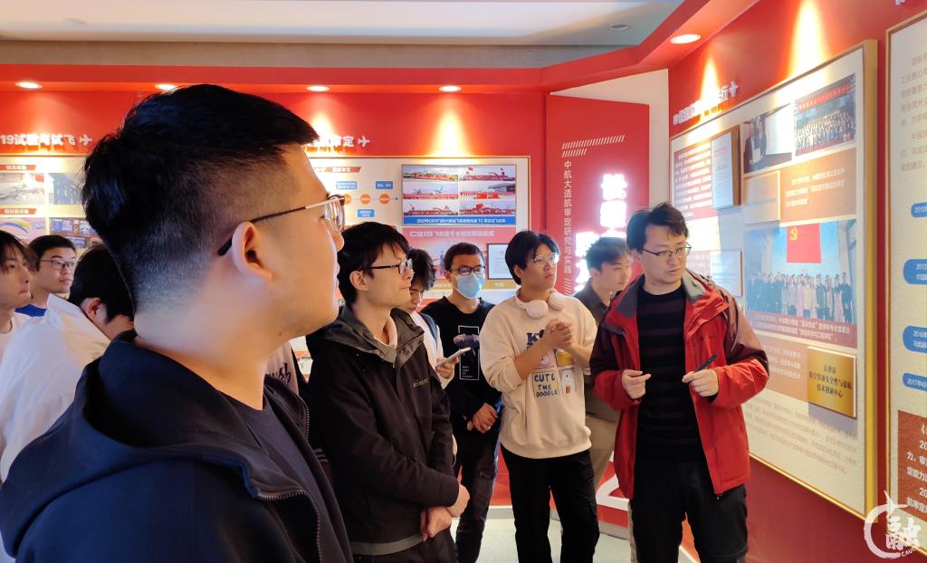 说是“导游”也可谓是名副其实。教育基地里的每一块展板的内容、每一件展品的位置以及每一段中航大人与国产大飞机背后的故事,田毅都烂熟于心。每到一处,他都娓娓道来,用生动且专业的语言为大家讲解展板上丰富多彩的内容。