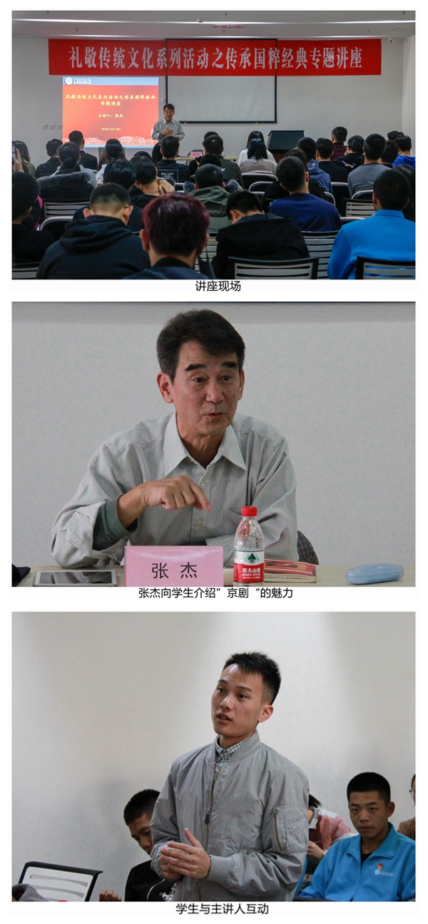 为贯彻落实习近平新时代中国特色社会主义思想和党的十九大精神,全面提高学校美育水平,提高学生人文素养和文化自信,天津京剧院院长、国家一级演员张杰受邀来到中国民航大学开展讲座,普及和传播京剧文化。