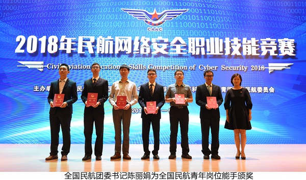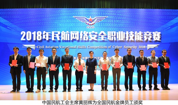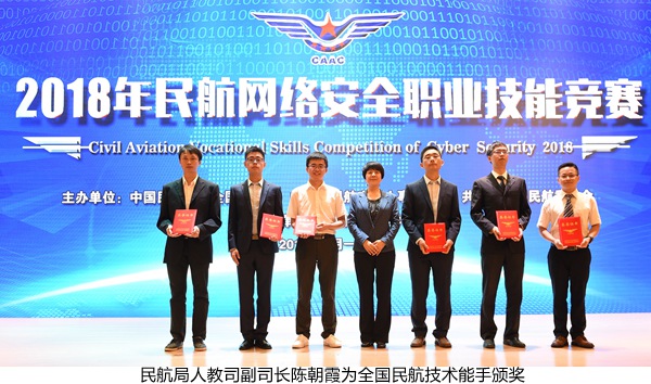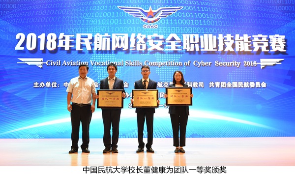 本网讯9月19日,2018年民航网络安全职业技能竞赛闭幕式暨颁奖仪式在中国民航大学举行。国家创新与发展战略研究会副会长郝叶力,公安部网络安全保卫局七处处长祝国邦,中国民航工会常务副主席黄丽辉,中国民用航空局人事科教司副司长陈朝霞,全国民航团委书记陈丽娟,中国民航大学校长董健康、副校长吕宗平、党委副书记工会主席赵洪海出席闭幕式并为本次竞赛的获奖选手颁奖。中国民航大学被授予“特别贡献奖”。