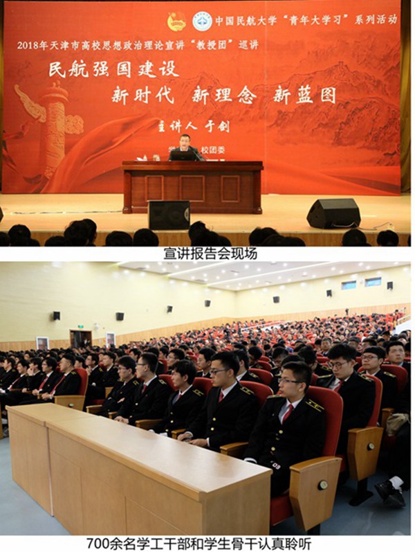 11月9日,天津市思想政治理论宣讲“教授团”巡讲报告在中航大礼堂举行,“教授团”成员、中国民航大学副校长于剑做“民航强国建设——新时代•新理念•新蓝图”专题报告。全体学工干部、学生骨干、校冯如班成员、校“百优英才”班学员等700余名教师、学生代表参加巡讲。