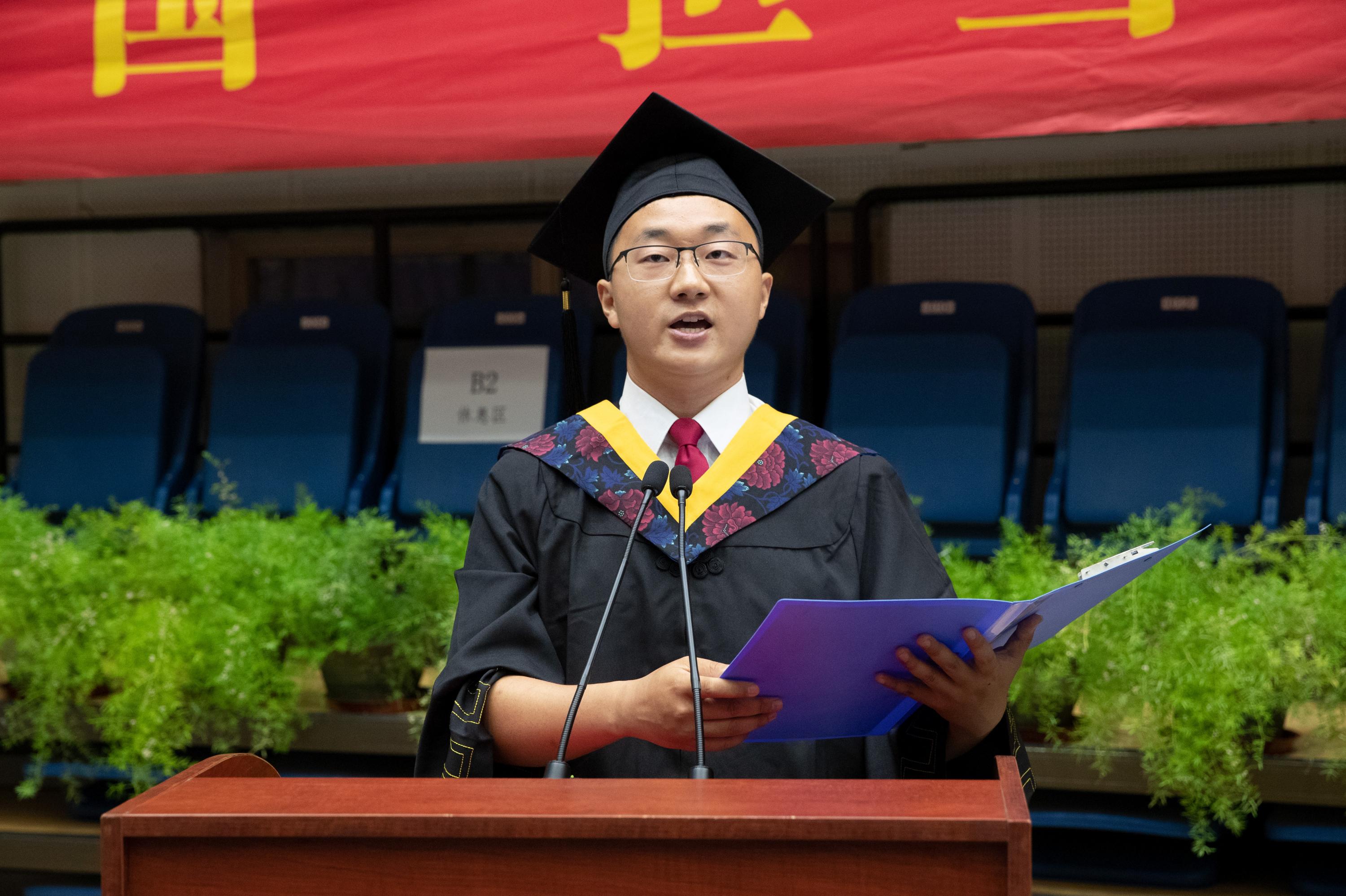 毕业生代表、航空工程学院学生马天驹代表全体毕业生回忆了奋发向上、努力拼搏的校园时光,回味了如何在四年中成长为一名有理想、有信仰、有责任、有担当的中航大人。他与大家共勉,未来要承载着母校的荣光,怀揣着母校沉甸甸的爱与感恩,一往直前、扬帆起航,用实际行动为祖国撑起万里蓝天,为民航强国建设贡献青春力量。