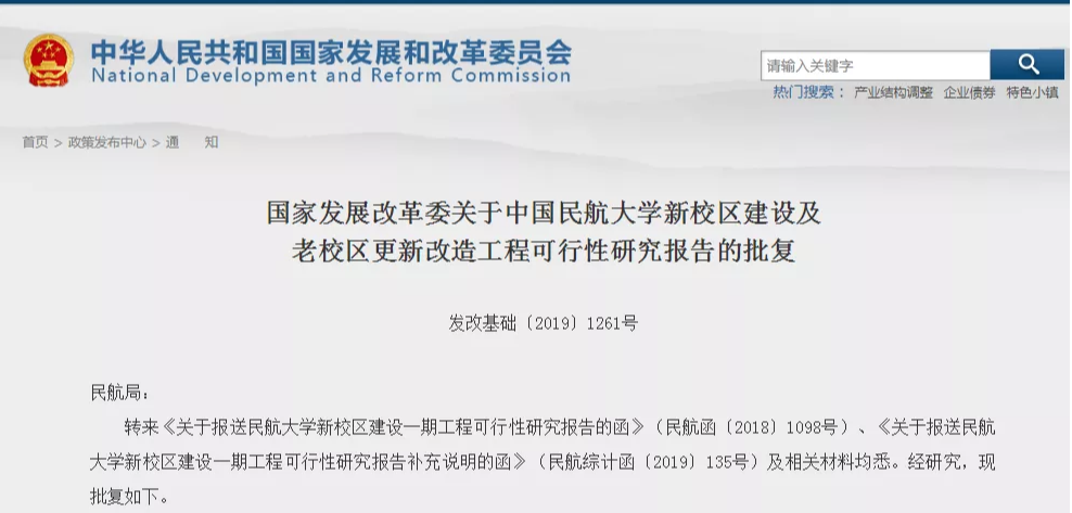 7月24日,国家发改委批复同意实施中国民航大学新校区建设及老校区更新改造工程,新校区位于天津市宁河区未来科技城。总建筑面积17.73万平方米,项目总投资约20.25亿元,其中中央预算内投资5亿元。