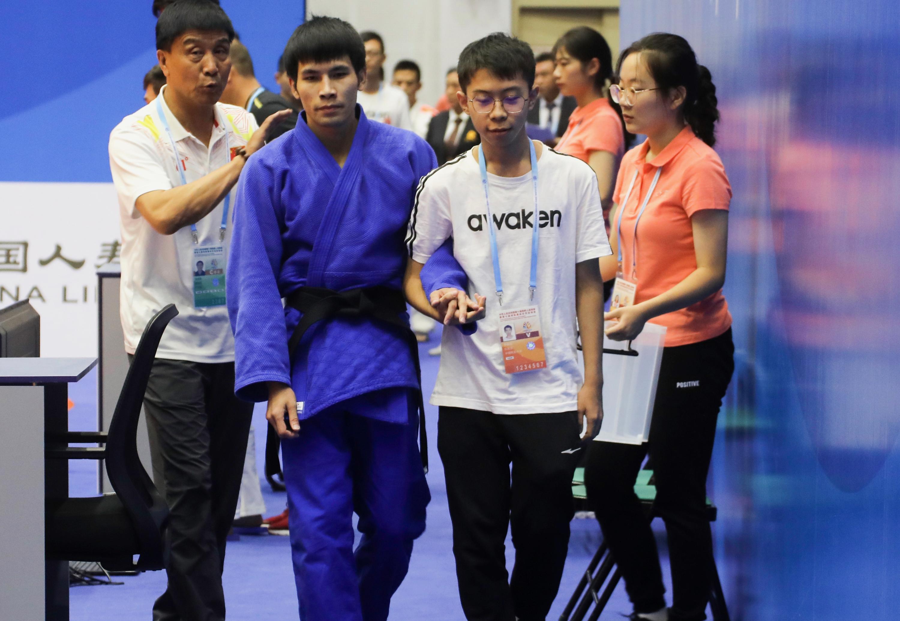 志愿者紧握运动员的手引领运动员