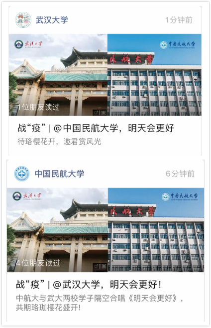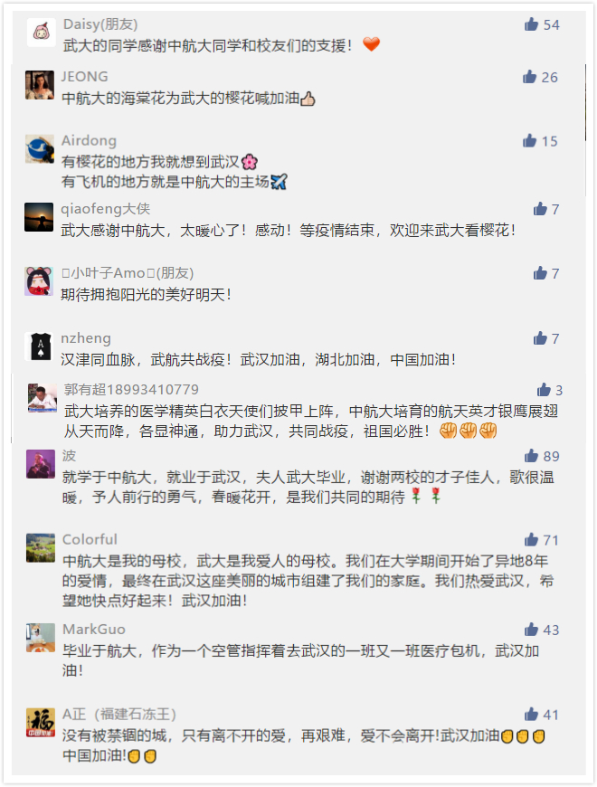 “2020无法重启,我们依然深深热爱,相信明天会更好。”一句评论道出了中航大和武大学生的心声。