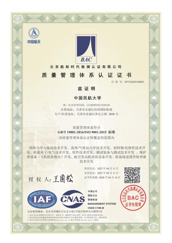 在原有基础上,本次认证工作由科技处牵头组织,在电子信息与自动化学院、航空工程学院、科技创新研究院、交通科学与工程学院等单位的积极配合和支持下,结合近年来学校承担的科研项目所在的技术领域和科研合作单位提出的新需求,认证覆盖范围拓宽到9个方向,包括固体力学与振动技术开发、流体/气体动力学技术开发、材料物/化特性技术开发、机载电子/电气技术开发、软件技术开发、测试装备与测试技术开发、维护类设备(飞机机轮抱夹)开发、航空发动机清洗设备开发、机场场道建管检养新技术开发等。认证过程中,审核专家通过文件审查、现场走访、座谈询问等方式,对学校拓宽ISO 9001质量管理体系认证范围及运行效果进行了全面审核和严格评估,一致认可学校实施的质量管理体系符合国际标准要求,最终顺利通过此次认证。