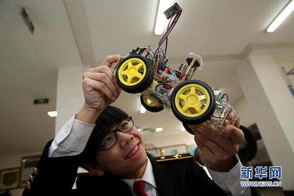 12月18日,学生展示自主设计、制作的室内无线导航系统。新华网发(庞杰 摄)