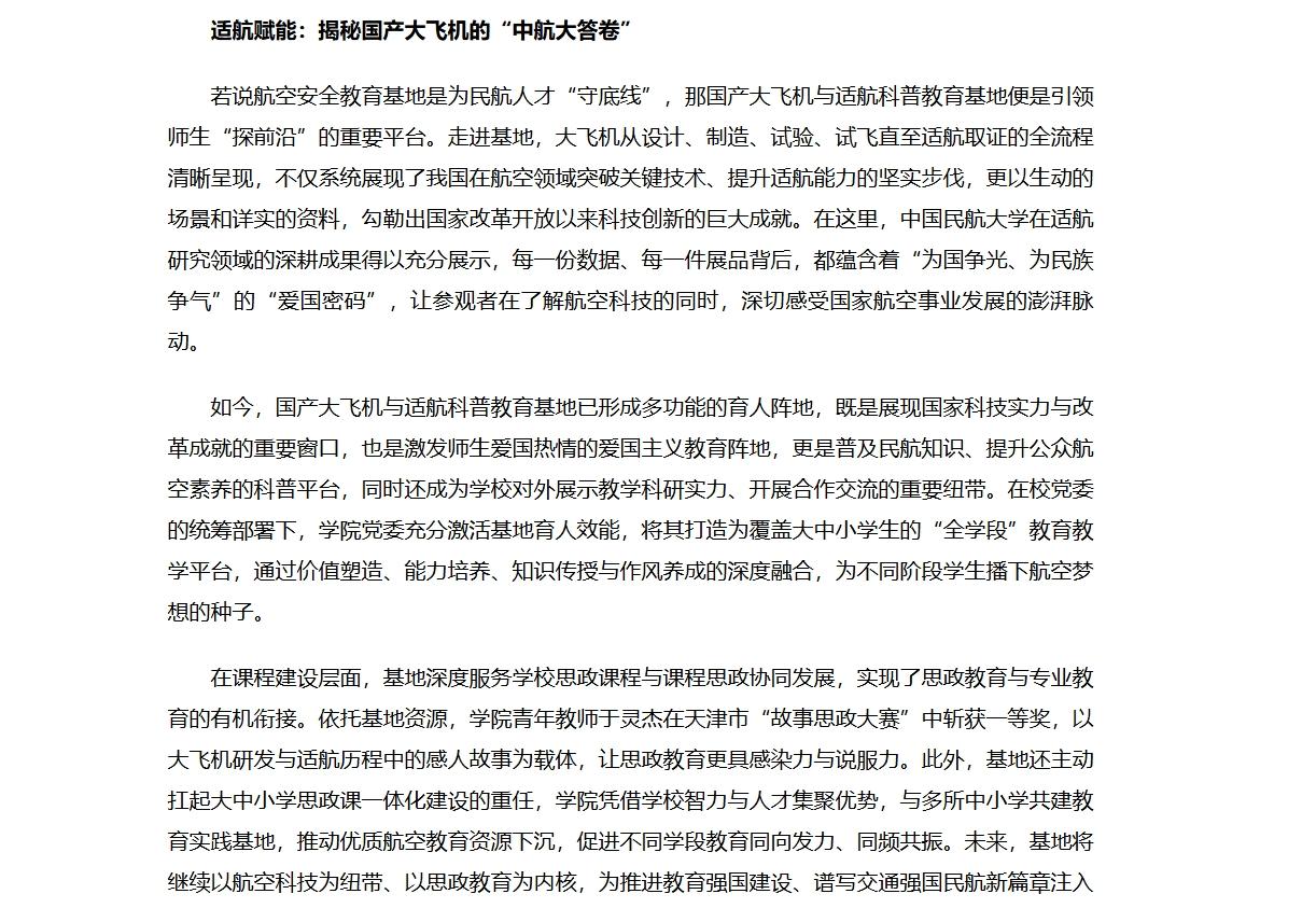 在课程建设层面,基地深度服务学校思政课程与课程思政协同发展,实现了思政教育与专业教育的有机衔接。依托基地资源,学院青年教师于灵杰在天津市“故事思政大赛”中斩获一等奖,以大飞机研发与适航历程中的感人故事为载体,让思政教育更具感染力与说服力。此外,基地还主动扛起大中小学思政课一体化建设的重任,学院凭借学校智力与人才集聚优势,与多所中小学共建教育实践基地,推动优质航空教育资源下沉,促进不同学段教育同向发力、同频共振。未来,基地将继续以航空科技为纽带、以思政教育为内核,为推进教育强国建设、谱写交通强国民航新篇章注入更多力量。
