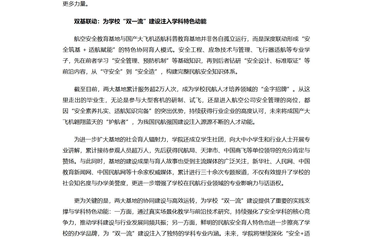 更为关键的是,两大基地的协同建设与高效运转,为学校“双一流”建设提供了重要的实践支撑与学科特色动能:一方面,通过真实场景化教学与前沿技术研究,持续强化了安全学科的核心竞争力,推动学科建设与行业发展同频共振;另一方面,鲜明的民航安全育人特色也进一步擦亮了学校的办学品牌,为“双一流”建设注入了独特的学科专业内涵。未来,学院将继续深化“安全+适航”协同育人机制,在助力我国民航事业高质量发展的同时,为推进 “双一流” 建设、培养更多高素质民航专业人才贡献更大力量。