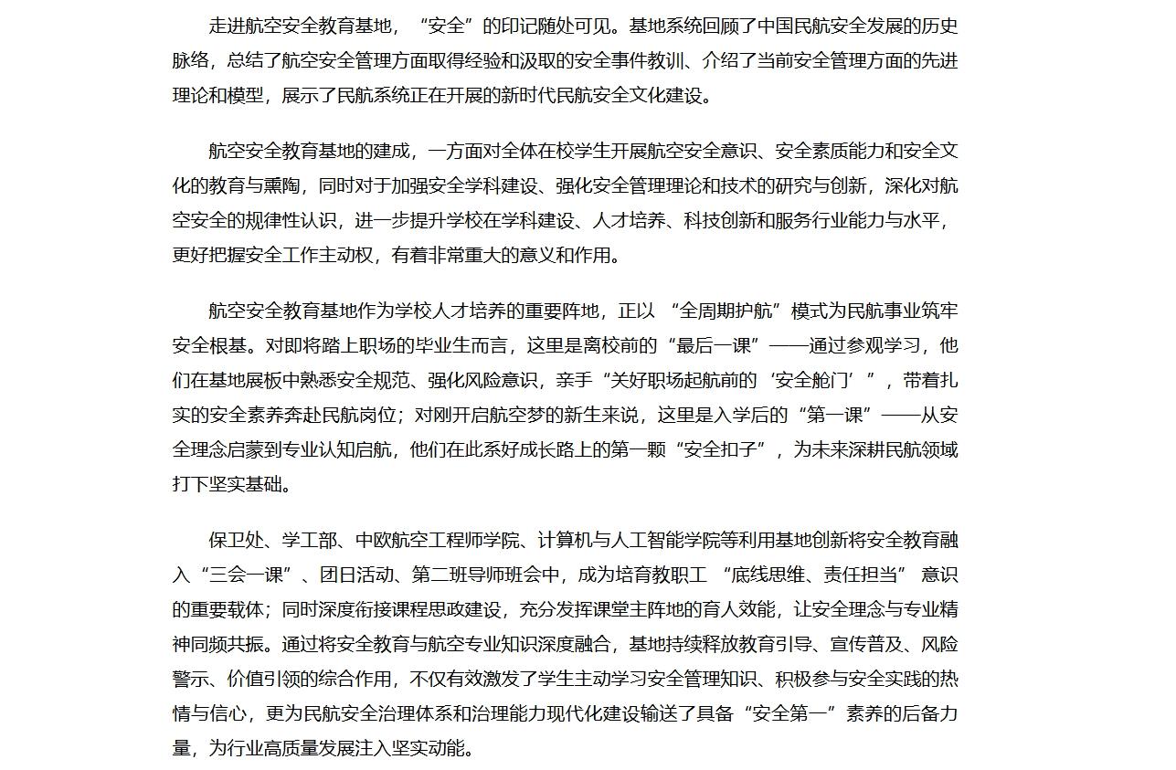 保卫处、学工部、中欧航空工程师学院、计算机与人工智能学院等利用基地创新将安全教育融入“三会一课”、团日活动、第二班导师班会中,成为培育教职工 “底线思维、责任担当” 意识的重要载体;同时深度衔接课程思政建设,充分发挥课堂主阵地的育人效能,让安全理念与专业精神同频共振。通过将安全教育与航空专业知识深度融合,基地持续释放教育引导、宣传普及、风险警示、价值引领的综合作用,不仅有效激发了学生主动学习安全管理知识、积极参与安全实践的热情与信心,更为民航安全治理体系和治理能力现代化建设输送了具备“安全第一”素养的后备力量,为行业高质量发展注入坚实动能。