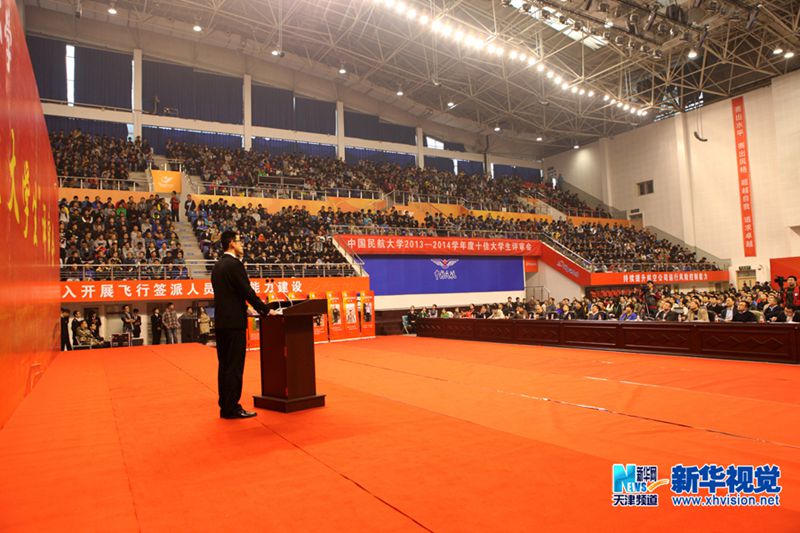 新华网天津频道11月1日电 10月31日,中国民航大学第十三届“十佳大学生”评选会在南院体育馆主馆举行。中国民航大学校领导、相关学院(部处)专家学者、负责人及教师担任评委,3200余名新生和选手亲友团齐聚体育馆。