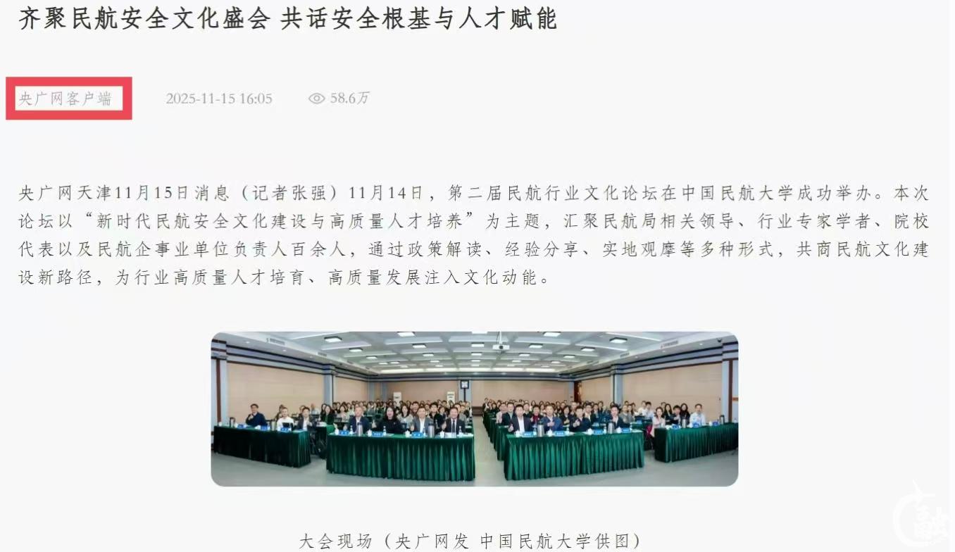 央广网天津11月15日消息(记者张强)11月14日,第二届民航行业文化论坛在中国民航大学成功举办。本次论坛以“新时代民航安全文化建设与高质量人才培养”为主题,汇聚民航局相关领导、行业专家学者、院校代表以及民航企事业单位负责人百余人,通过政策解读、经验分享、实地观摩等多种形式,共商民航文化建设新路径,为行业高质量人才培育、高质量发展注入文化动能。