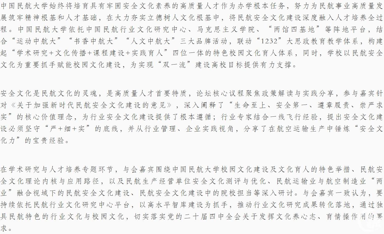 中国民航大学始终将培育具有牢固安全文化素养的高质量人才作为办学根本任务,努力为民航事业高质量发展筑牢精神根基和人才基础,在大力夯实立德树人文化根基中,将民航安全文化建设深度融入人才培养全过程。中国民航大学依托中国民航行业文化研究中心、马克思主义学院、“两馆四基地”等阵地平台,结合“运动中航大”“书香中航大”“人文中航大”三大品牌活动,联动“1232”大思政教育教学体系,构建起“学术研究+文化传播+课程建设+实践育人”四位一体的特色校园文化育人体系,同时,学校以民航安全文化为重要抓手赋能校园文化建设,为实现“双一流”建设高校目标提供有力支撑。