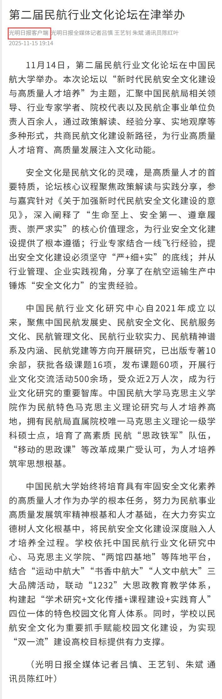 11月14日,第二届民航行业文化论坛在中国民航大学举办。本次论坛以“新时代民航安全文化建设与高质量人才培养”为主题,汇聚中国民航局相关领导、行业专家学者、院校代表以及民航企事业单位负责人百余人,通过政策解读、经验分享、实地观摩等多种形式,共商民航文化建设新路径,为行业高质量人才培育、高质量发展注入文化动能。