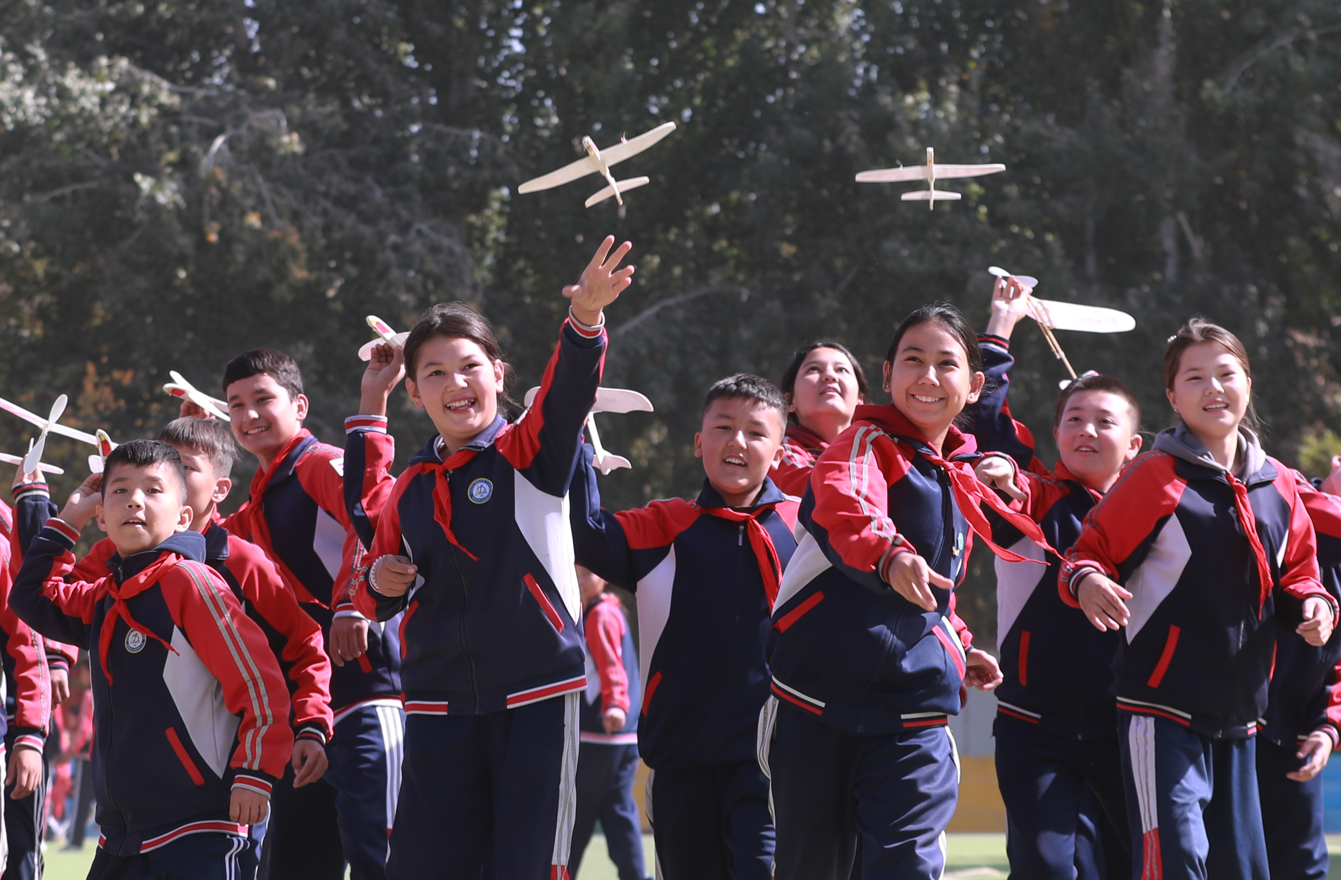 在新疆和田地区策勒县达玛沟乡中心小学,学生们放飞自己动手制作的飞机模型。(中国教育报记者 张学军 摄)