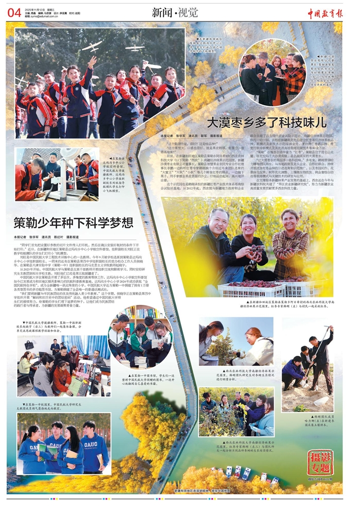 本网讯 11月12日,《中国教育报》新闻视觉版以《策勒少年种下科学梦想》为题,将目光投向新疆和田,在中国民航大学第五批援疆教师接力的讲台上,在达玛沟乡小学崭新的航空科普馆里,一场关于梦想与坚守的教育实践,正让民航的种子在天山脚下生根发芽……