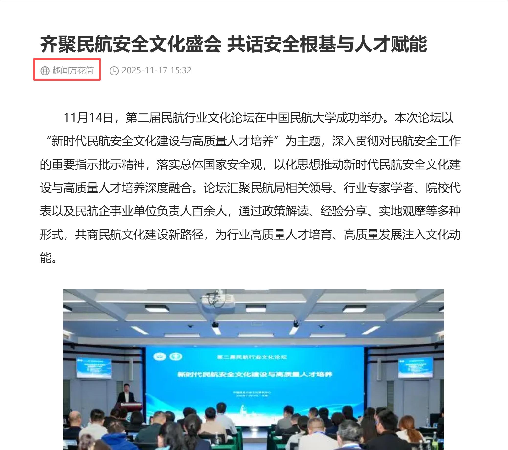 11月14日,第二届民航行业文化论坛在中国民航大学成功举办。本次论坛以“新时代民航安全文化建设与高质量人才培养”为主题,深入贯彻对民航安全工作的重要指示批示精神,落实总体国家安全观,以化思想推动新时代民航安全文化建设与高质量人才培养深度融合。论坛汇聚民航局相关领导、行业专家学者、院校代表以及民航企事业单位负责人百余人,通过政策解读、经验分享、实地观摩等多种形式,共商民航文化建设新路径,为行业高质量人才培育、高质量发展注入文化动能。