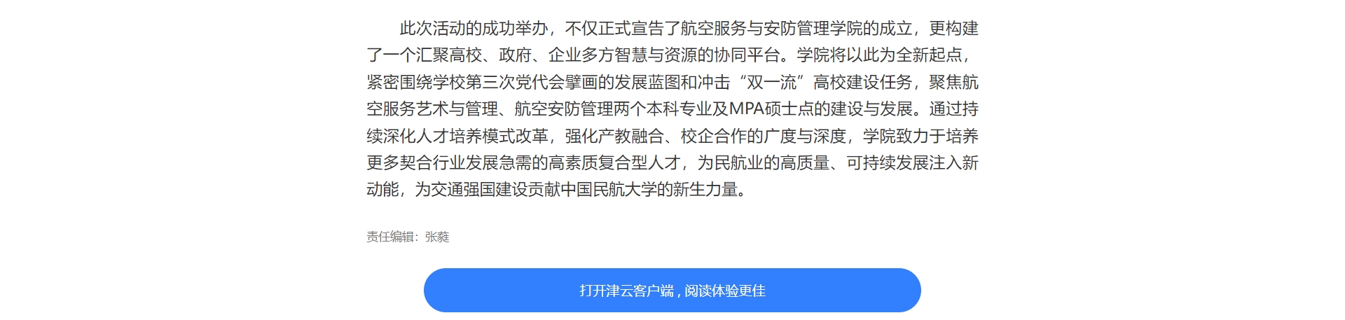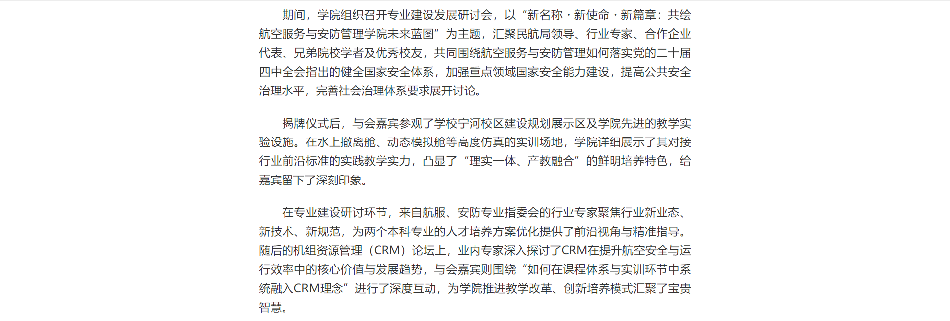 此次活动的成功举办,不仅正式宣告了航空服务与安防管理学院的成立,更构建了一个汇聚高校、政府、企业多方智慧与资源的协同平台。学院将以此为全新起点,紧密围绕学校第三次党代会擘画的发展蓝图和冲击“双一流”高校建设任务,聚焦航空服务艺术与管理、航空安防管理两个本科专业及MPA硕士点的建设与发展。通过持续深化人才培养模式改革,强化产教融合、校企合作的广度与深度,学院致力于培养更多契合行业发展急需的高素质复合型人才,为民航业的高质量、可持续发展注入新动能,为交通强国建设贡献中国民航大学的新生力量。