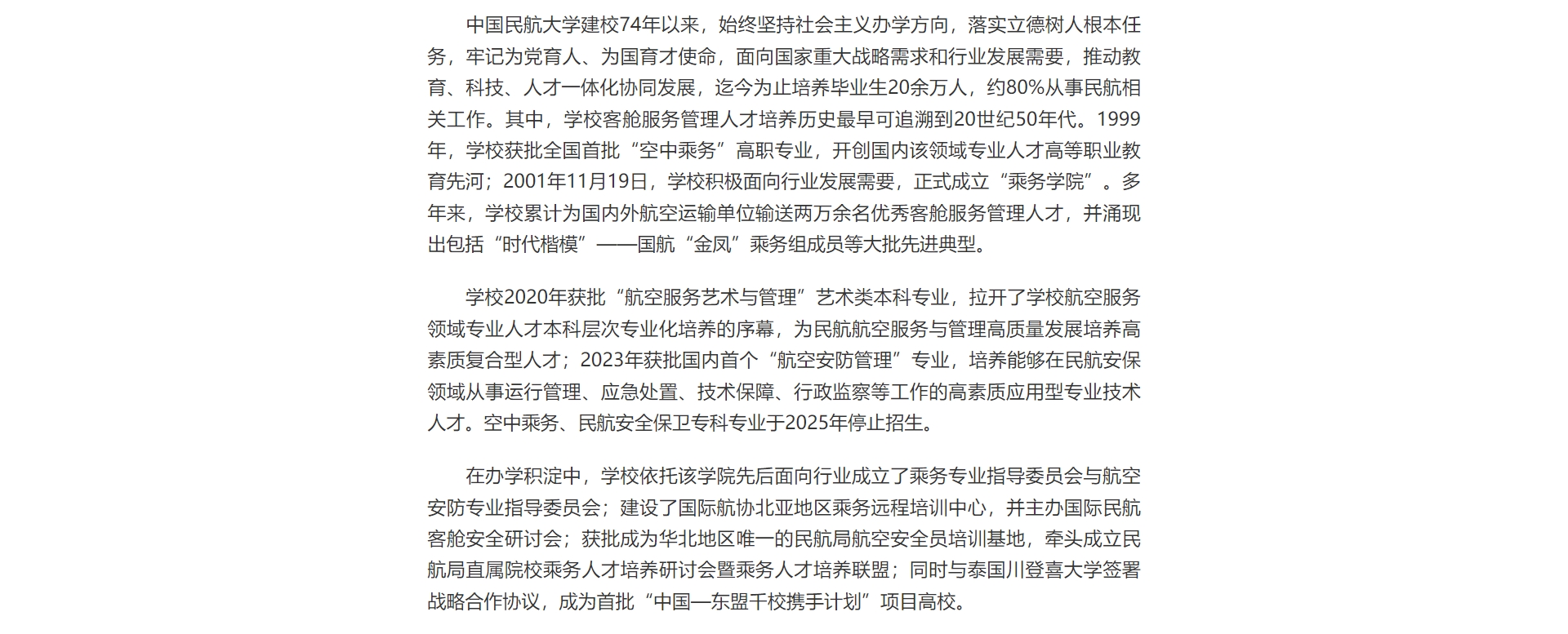 中国民航大学建校74年以来,始终坚持社会主义办学方向,落实立德树人根本任务,牢记为党育人、为国育才使命,面向国家重大战略需求和行业发展需要,推动教育、科技、人才一体化协同发展,迄今为止培养毕业生20余万人,约80%从事民航相关工作。其中,学校客舱服务管理人才培养历史最早可追溯到20世纪50年代。1999年,学校获批全国首批“空中乘务”高职专业,开创国内该领域专业人才高等职业教育先河;2001年11月19日,学校积极面向行业发展需要,正式成立“乘务学院”。多年来,学校累计为国内外航空运输单位输送两万余名优秀客舱服务管理人才,并涌现出包括“时代楷模”——国航“金凤”乘务组成员等大批先进典型。