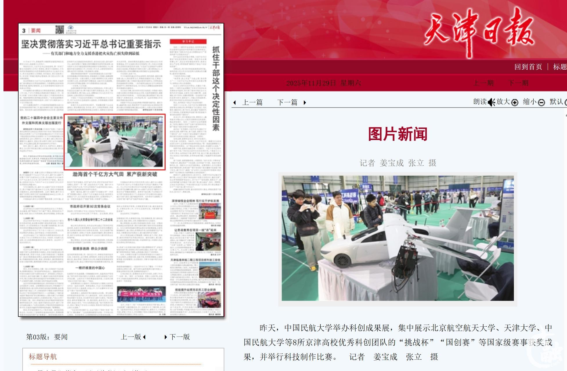 昨天,中国民航大学举办科创成果展,集中展示北京航空航天大学、天津大学、中国民航大学等8所京津高校优秀科创团队的“挑战杯”“国创赛”等国家级赛事获奖成果,并举行科技制作比赛。