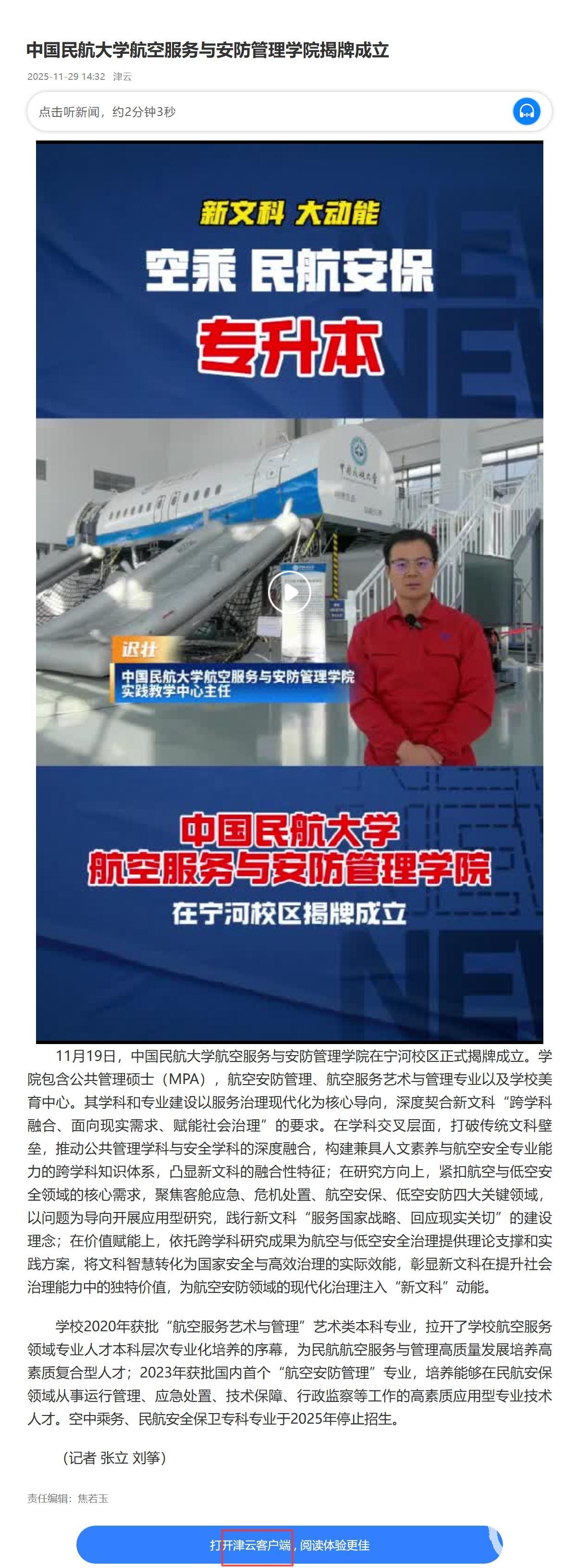 11月19日,中国民航大学航空服务与安防管理学院在宁河校区正式揭牌成立。学院包含公共管理硕士(MPA),航空安防管理、航空服务艺术与管理专业以及学校美育中心。其学科和专业建设以服务治理现代化为核心导向,深度契合新文科“跨学科融合、面向现实需求、赋能社会治理”的要求。在学科交叉层面,打破传统文科壁垒,推动公共管理学科与安全学科的深度融合,构建兼具人文素养与航空安全专业能力的跨学科知识体系,凸显新文科的融合性特征;在研究方向上,紧扣航空与低空安全领域的核心需求,聚焦客舱应急、危机处置、航空安保、低空安防四大关键领域,以问题为导向开展应用型研究,践行新文科“服务国家战略、回应现实关切”的建设理念;在价值赋能上,依托跨学科研究成果为航空与低空安全治理提供理论支撑和实践方案,将文科智慧转化为国家安全与高效治理的实际效能,彰显新文科在提升社会治理能力中的独特价值,为航空安防领域的现代化治理注入“新文科”动能。