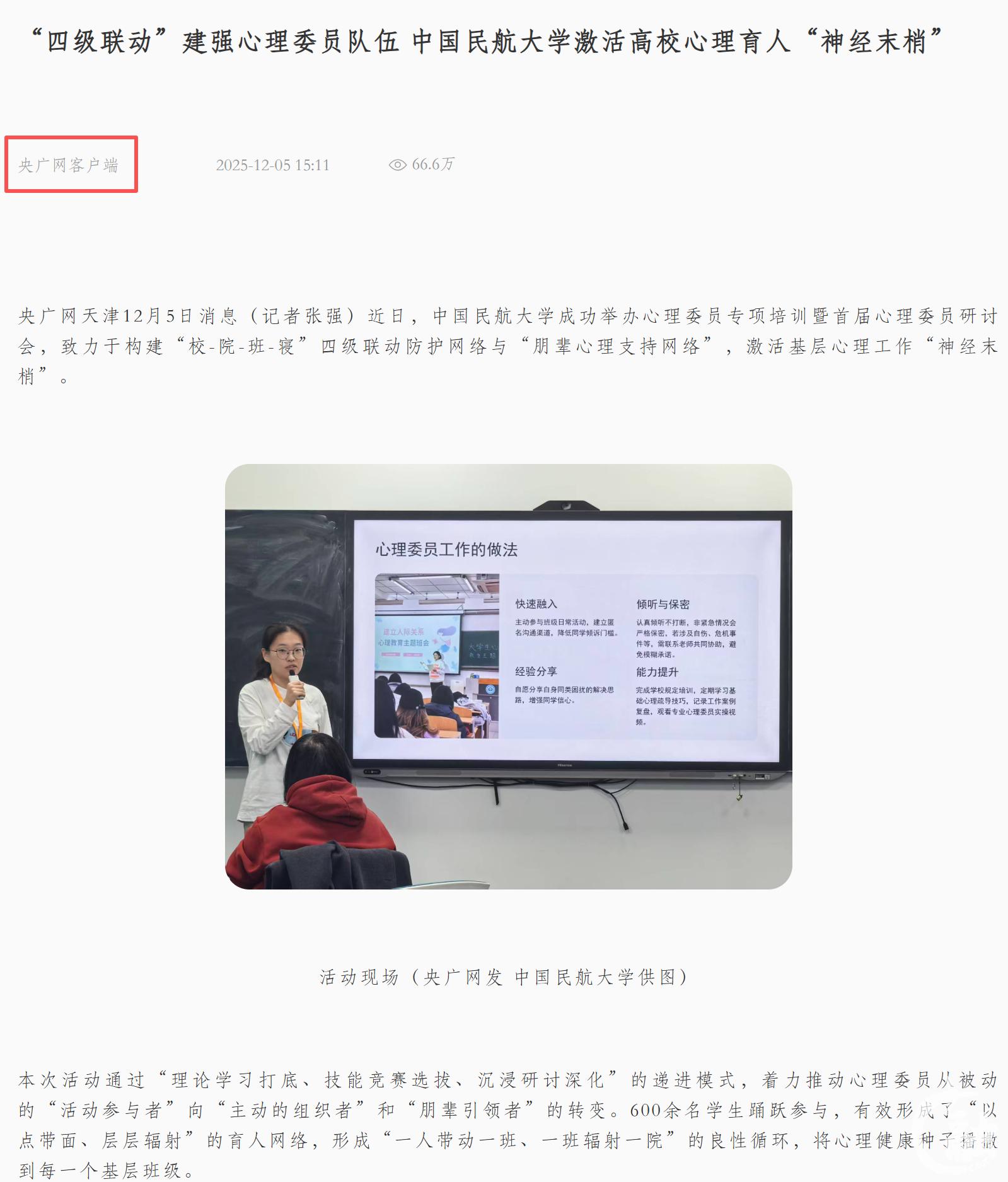 央广网客户端:“四级联动”建强心理委员队伍 中国民航大学激活高校心理育人“神经末梢”
