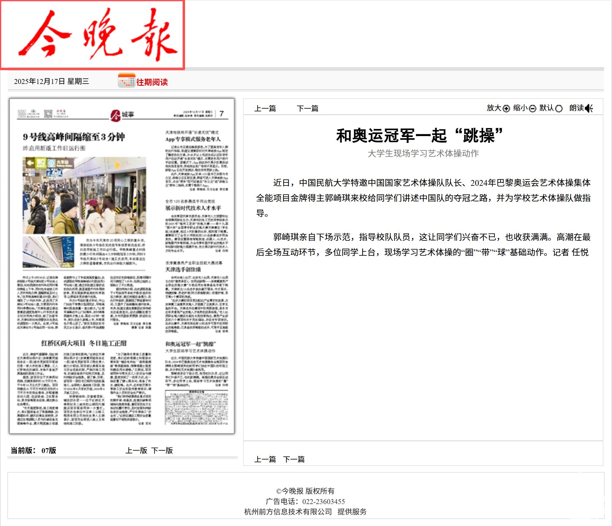 近日,中国民航大学特邀中国国家艺术体操队队长、2024年巴黎奥运会艺术体操集体全能项目金牌得主郭崎琪来校给同学们讲述中国队的夺冠之路,并为学校艺术体操队做指导。
