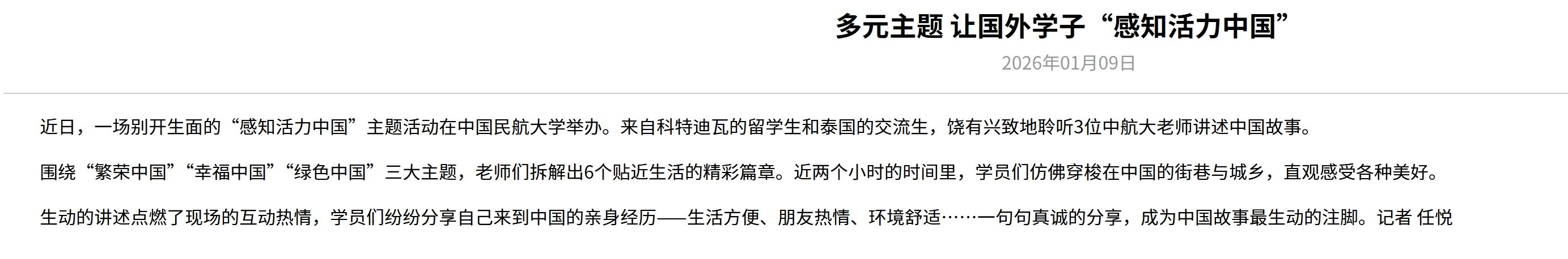 近日,一场别开生面的“感知活力中国”主题活动在中国民航大学举办。来自科特迪瓦的留学生和泰国的交流生,饶有兴致地聆听3位中航大老师讲述中国故事。