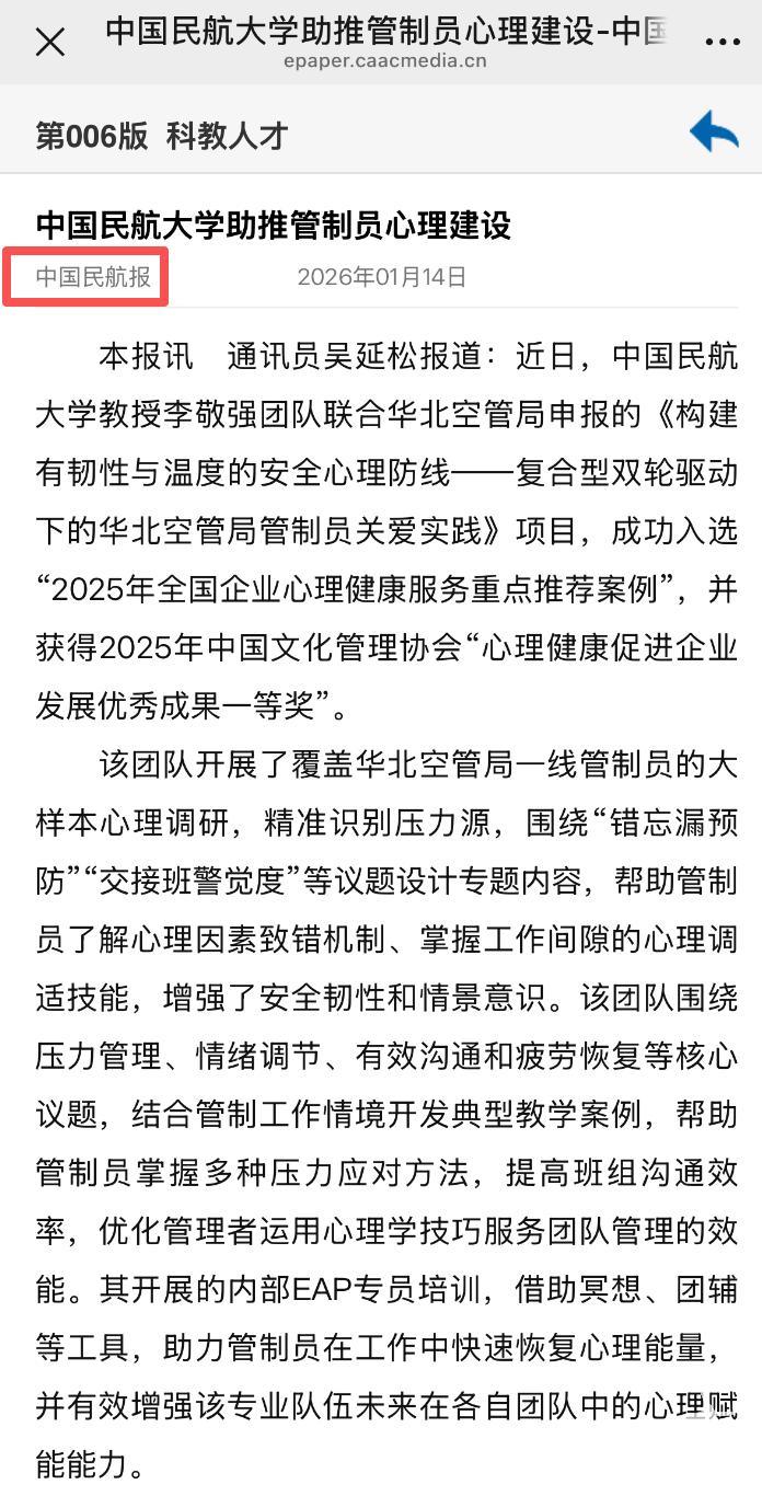 近日,中国民航大学教授李敬强团队联合华北空管局申报的《构建有韧性与温度的安全心理防线——复合型双轮驱动下的华北空管局管制员关爱实践》项目,成功入选“2025年全国企业心理健康服务重点推荐案例”,并获得2025年中国文化管理协会“心理健康促进企业发展优秀成果一等奖”。