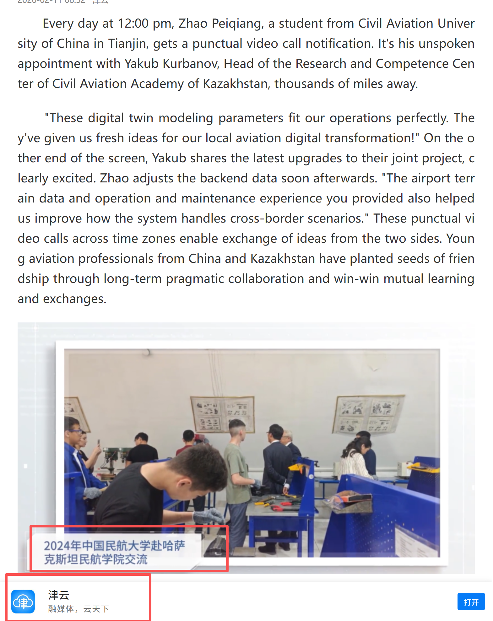 Every day at 12:00 pm, Zhao Peiqiang, a student from Civil Aviation University of China in Tianjin, gets a punctual video call notification. It's his unspoken appointment with Yakub Kurbanov, Head of the Research and Competence Center of Civil Aviation Academy of Kazakhstan, thousands of miles away.