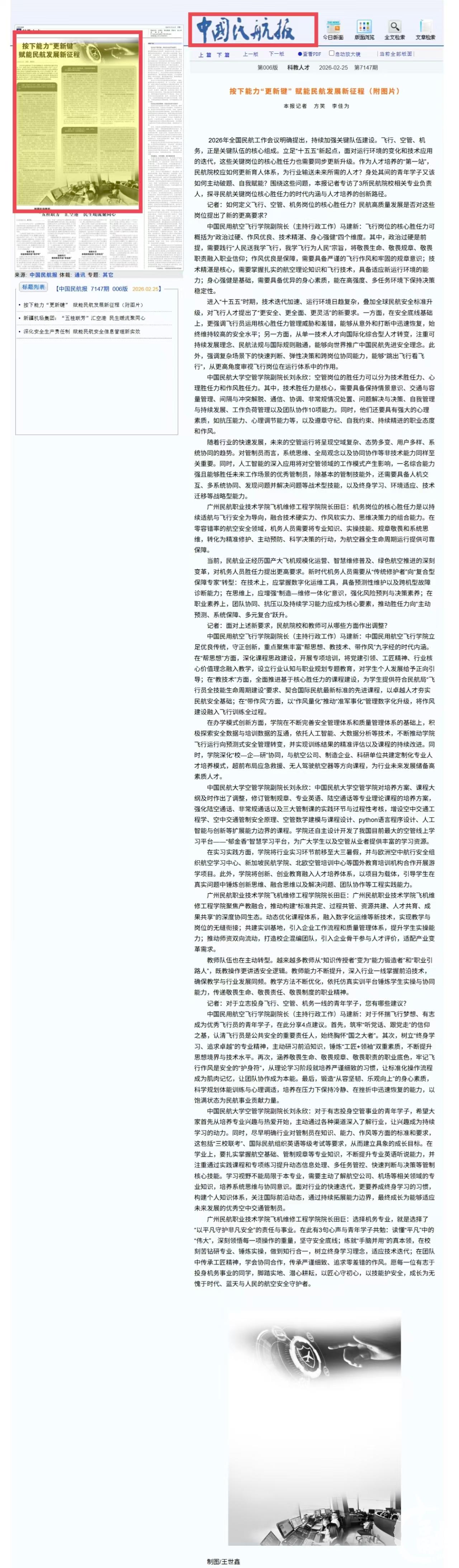 2026年全国民航工作会议明确提出,持续加强关键队伍建设。飞行、空管、机务,正是关键队伍的核心组成。立足“十五五”新起点,面对运行环境的变化和技术应用的迭代,这些关键岗位的核心胜任力也需要同步更新升级。作为人才培养的“第一站”,民航院校应如何更新育人体系,为行业输送未来所需的人才?身处其间的青年学子又该如何主动破题、自我赋能?围绕这些问题,本报记者专访了3所民航院校相关专业负责人,探寻民航关键岗位核心胜任力的时代内涵与人才培养的创新路径。