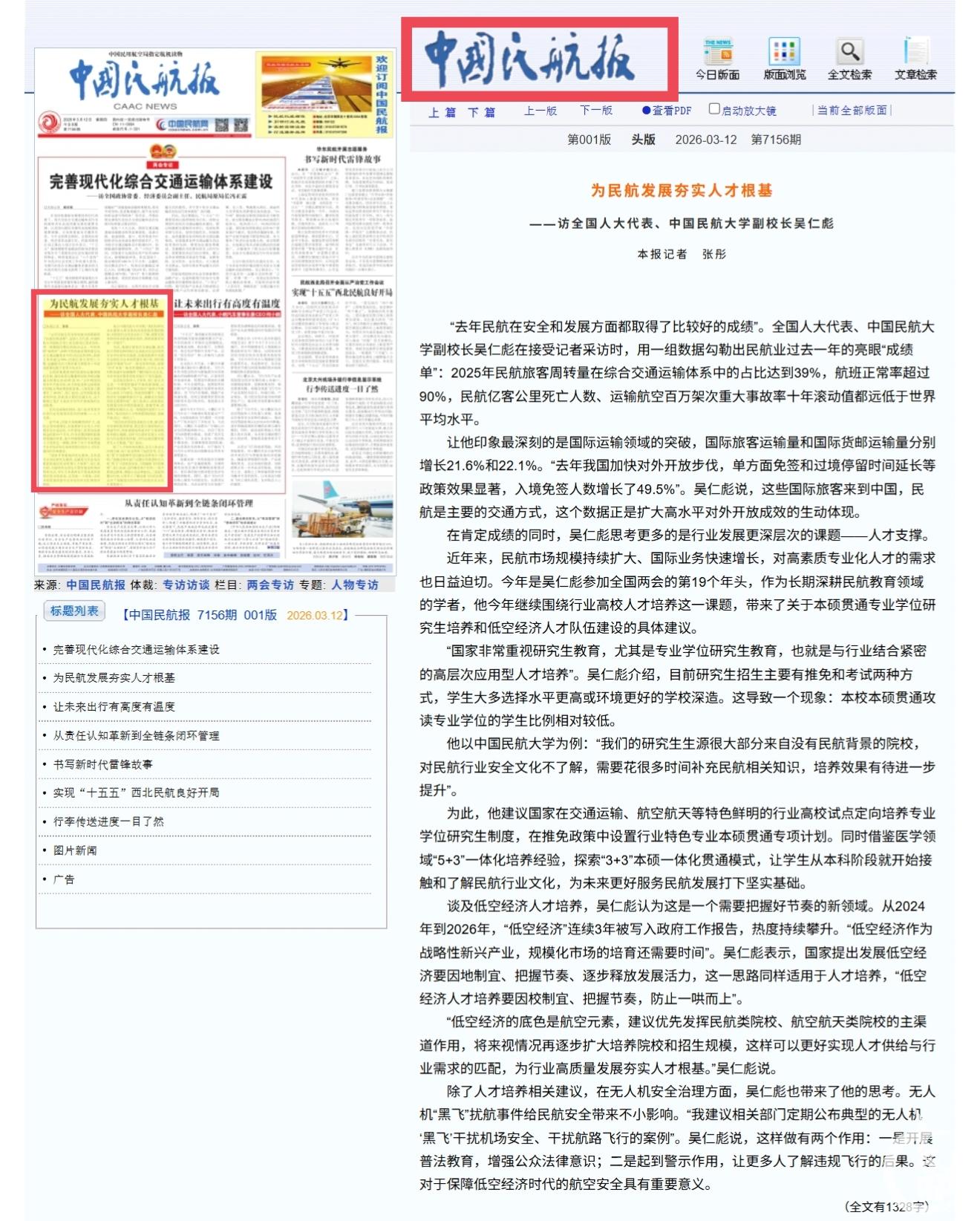 《中国民航报》头版:为民航发展夯实人才根基——访全国人大代表、中国民航大学副校长吴仁彪