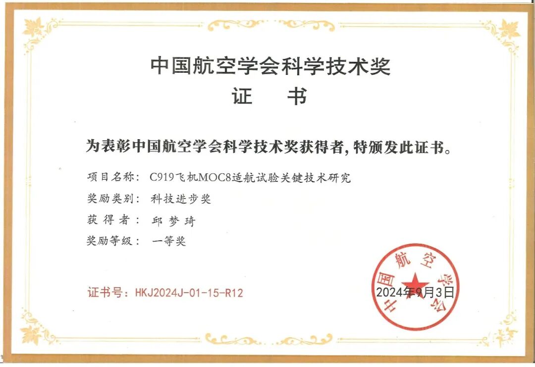 邱梦琦获奖中国航空学会科学技术奖一等奖