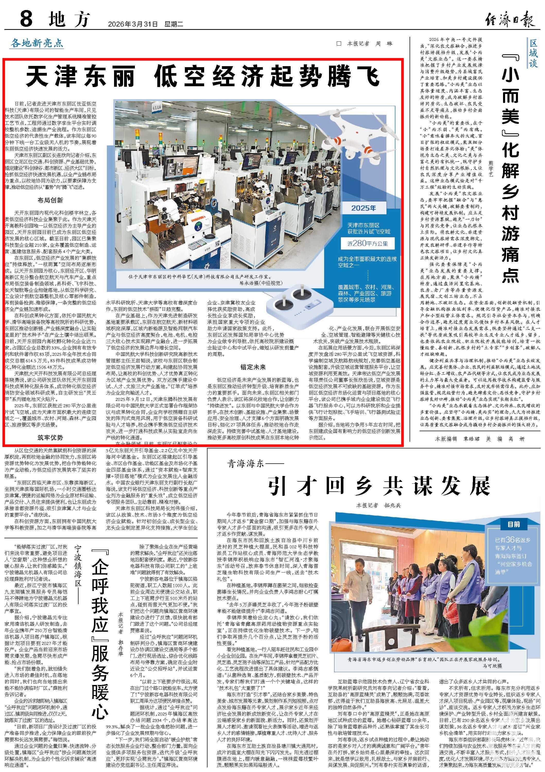 在金融领域,目前,东丽区已配套设立5亿元东丽天开引导基金、2.2亿元中发天开海河中诺基金。东丽区还搭建起区引导基金、市区合作基金、功能区基金及市场化子基金四层基金体系,通过“资本赋能+智库支撑+项目落地”模式为企业发展注入金融活水。中国农业银行天津东丽支行副行长赵广海说,该支行将低空经济、科技创新等重点产业列为金融服务的“重头戏”,成立低空经济专项服务团队,主动靠前、精准对接。