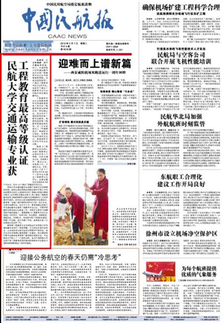 《中国民航报》头版头条:民航大学交通运输专业获工程教育最高等级认证