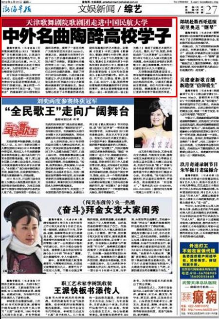《渤海早报》27版头条:中外名曲陶醉高校学子
