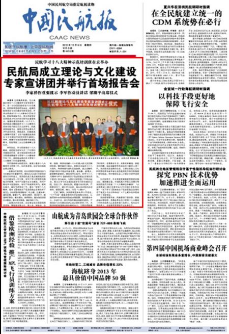 《中国民航报》头版头条:民航学习十八大精神示范培训班在京举办 校长吴桐水、人文学院王勇教授作为宣讲团受聘专家上台接受聘书
