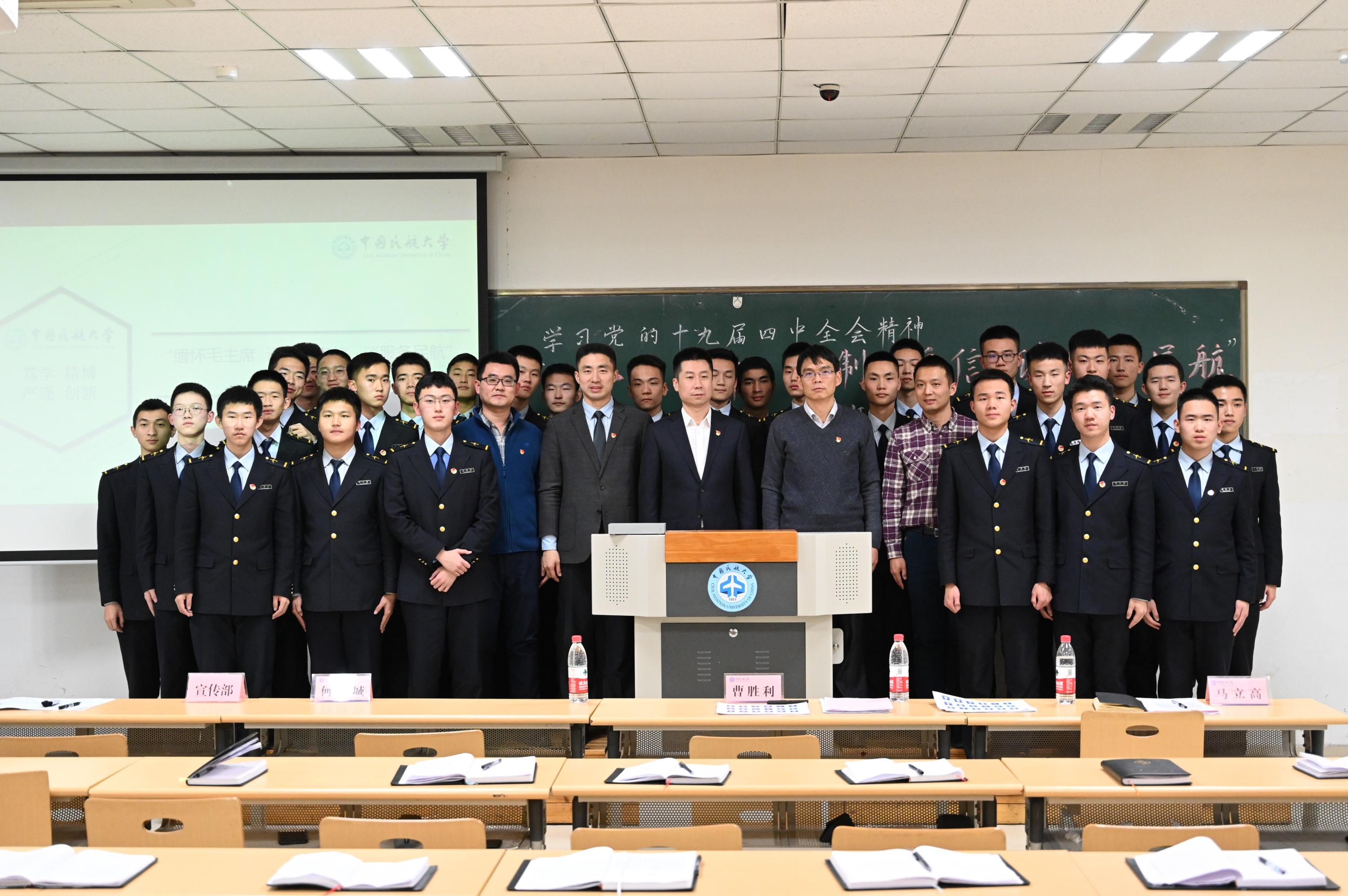 曹胜利向同学们讲述了中国共产党在领导中国人民革命、建设和改革的风雨历程中,经历的许许多多的重大事件,以及毛主席一生的奋斗历程。“同学们要做有志向的青年人,努力实现自己的理想。”曹胜利希望同学们在中航大努力学习,早日成为优秀的飞行员,“同学们要认真地学习党的十九届四中全会精神,在学习生活中勇于探索、敢于创新,有不断成长的决心和勇气,全方位提升自己的能力,在未来更好地投身到民航强国建设新征程中。”