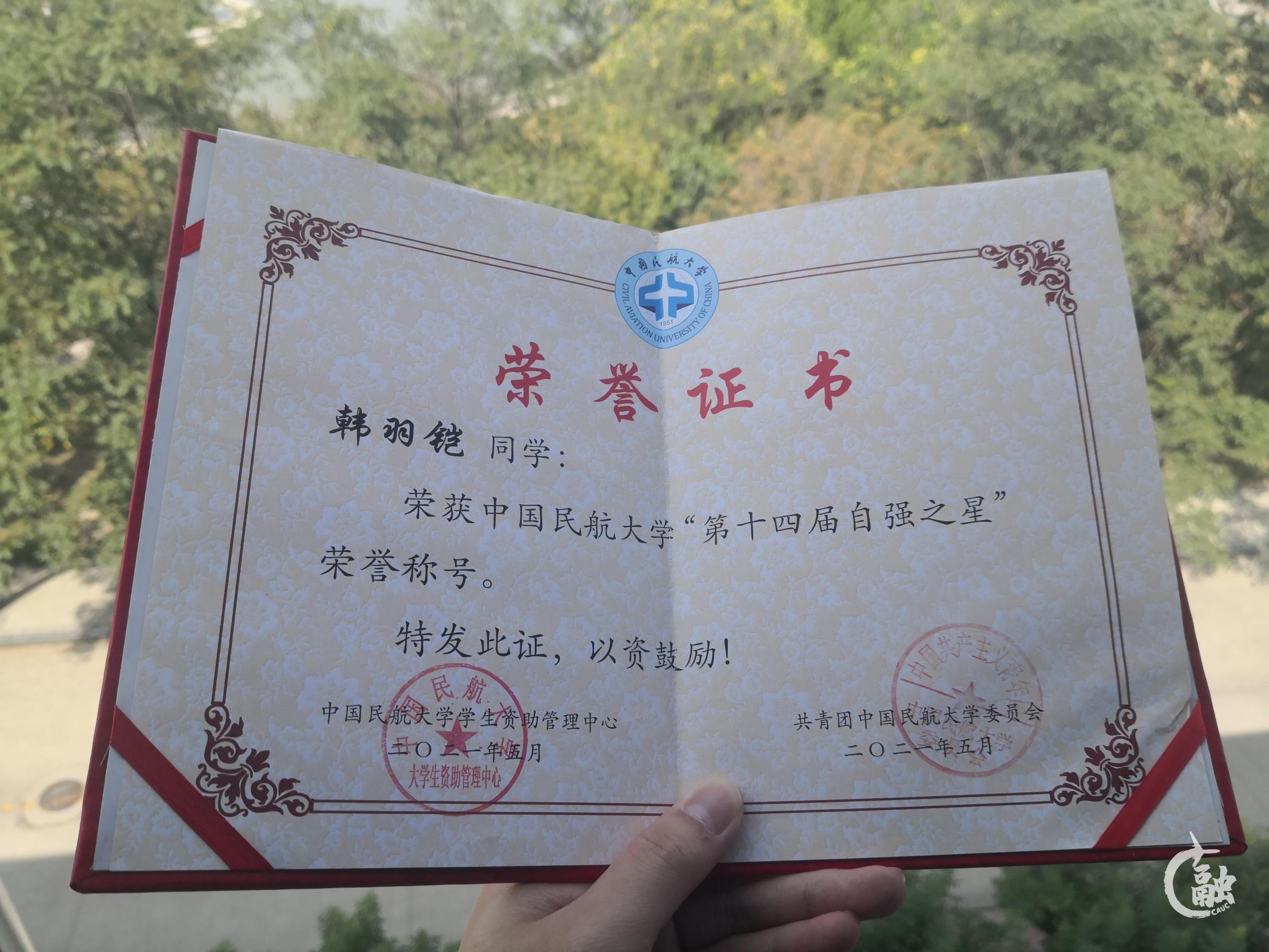 竞赛与科研是韩羽铠大学生活中浓墨重彩的一部分。大一的他加入了505创客实验室,在这里,有乐于助人的学长前辈们的倾囊相授,他自学了C语言的编写,在这里,他探究了单片机世界的奥秘。他曾完成大创项目、获全国大学生电子设计竞赛天津市二等奖、北斗杯比赛华北赛区一等奖并代表中国民航大学入围国赛取得北斗杯全国总决赛三等奖、美国大学生数学建模竞赛(MCM/ICM)获得Meritorious奖(国际一等奖)、全国大学生数学建模比赛天津市二等奖。面对这些成绩,他说:“对于每一个人来说,不如意之事总会在生活中常伴自己,得之受之,以此作为迈向更高处的垫脚板,始终保持一个进取之心,我想,这便是各类竞赛精神的含义所在吧。”