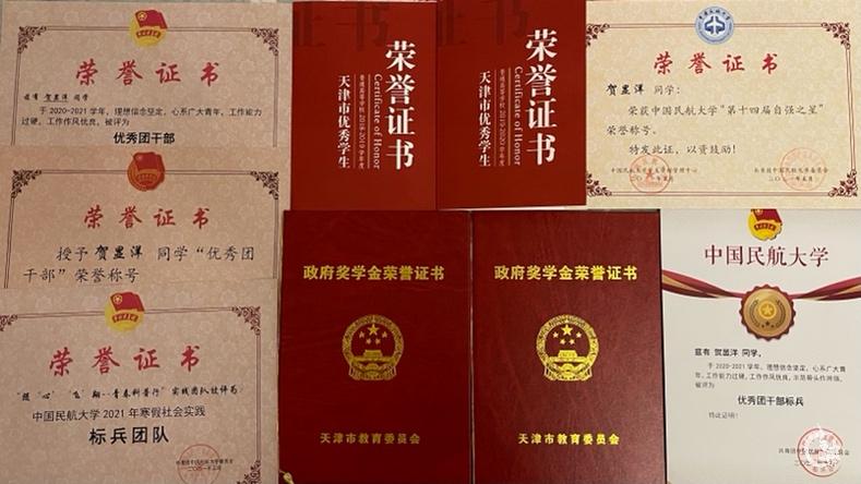 贺显洋,飞行分校2018级学生,在校综测排名2/784,平均绩点4.21,最高绩点4.33,全部英语类课程不低于90分,高分通过四六级和雅思,中国音乐学院10级水平小号乐手,《飞行学员》系列表情包原创设计师,飞行分校团委副书记、团委宣传部部长、飞行分校副校长学生助理、辅导员助理,连续2年获天津市人民政府奖学金、人民奖学金,连续2年获评天津市高校优秀学生、中国民航大学优秀团干部标兵,任职期间,飞行分校团委获天津市五四红旗团委。