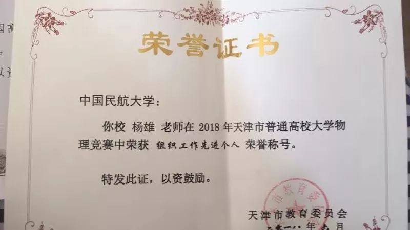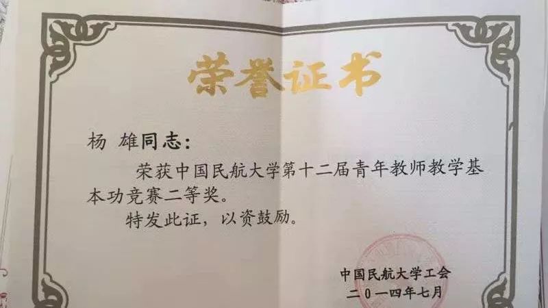 机缘巧合下,杨雄老师来到了中国民航大学任教,从此,老师就决定将他的青春奉献给中航大。从教以来,杨雄老师取得了很多成就,多次获得大大小小校内外荣誉:主持完成一项校级教育教学改革研究课题“同伴教学法应用于大学物理课程的探索”、作为第二项目组成员参与完成国家自然科学基金项目“刚玉型二元复合氧化物的结构与性能的理论研究”,获得中国民航大学优秀教学奖一等奖、第二届全国高校微课教学比赛天津市三等奖、中国民航大学第十二届青年教师教学基本功竞赛二等奖、2018年天津市普通高校大学物理竞赛组织工作先进个人荣誉称号等等。多项荣誉在身,杨雄老师却很低调,“我这么平凡一个人,我没想到你们会来采访我,应该多采访一些优秀的老师。”身为人民教师,在平凡的生活释放自己的能量传递给一代又一代祖国的未来,这件事本身就不平凡。