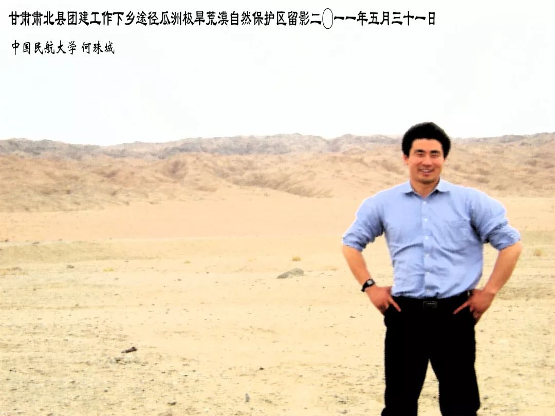2009年,何珠城开始担任246名飞行学生的辅导员。2011年,学生进入国外飞行训练,原本他可以轻松一年,但就在此时,教育部和团中央号召青年人到祖国西部最需要的地方去,他便毫不犹豫报了名,响应党和国家的号召,到2500公里之外的西部边陲,甘肃省唯一一个少数民族边境县(与外蒙古接壤的)肃北蒙古族自治县挂职团县委副书记,克服高原反应、抵抗风沙,开展挂职支边工作。