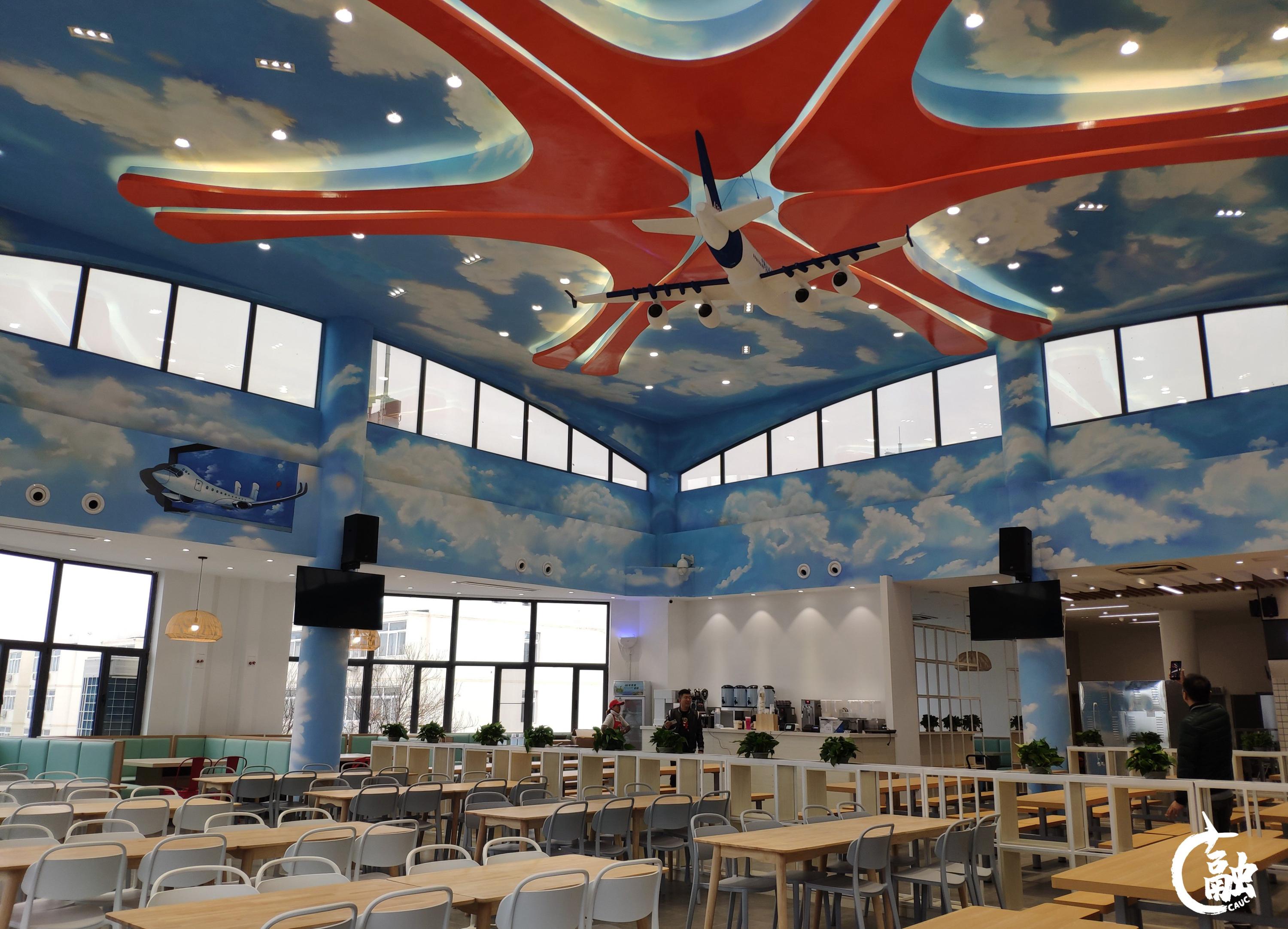 南区增加了一个全新的食堂:南一食堂三楼,食堂进行了全新装修升级,打造航空主题风格,吊顶参考北京大兴国际机场俯瞰图,中间悬挂飞机模型,象征中航大学子展翅高飞,整个餐区以蓝天白云为主要背景,环境轻松舒适。